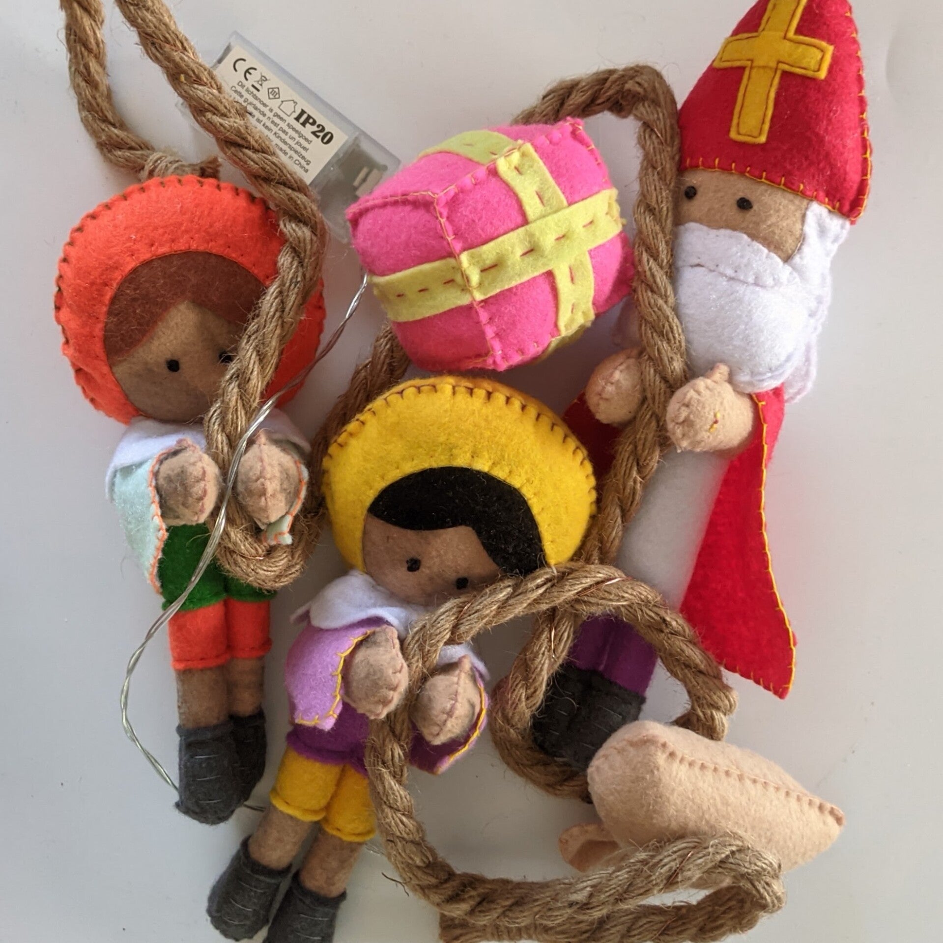 Aan dit Pietentouw komen twee Pietjes, een cadeautje en een cadeauzakje. Let op! Aan dit Pietentouw wordt géén Sinterklaas gemaakt. Wil je een touw met een Sinterklaas? Deze kun je bestellen via Pietentouw met Sinterklaas. Als deze uitverkocht zijn, komt Sinterklaas dit jaar ook niet meer op voorraad.